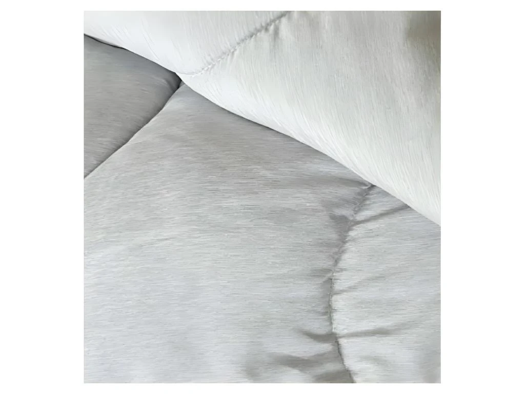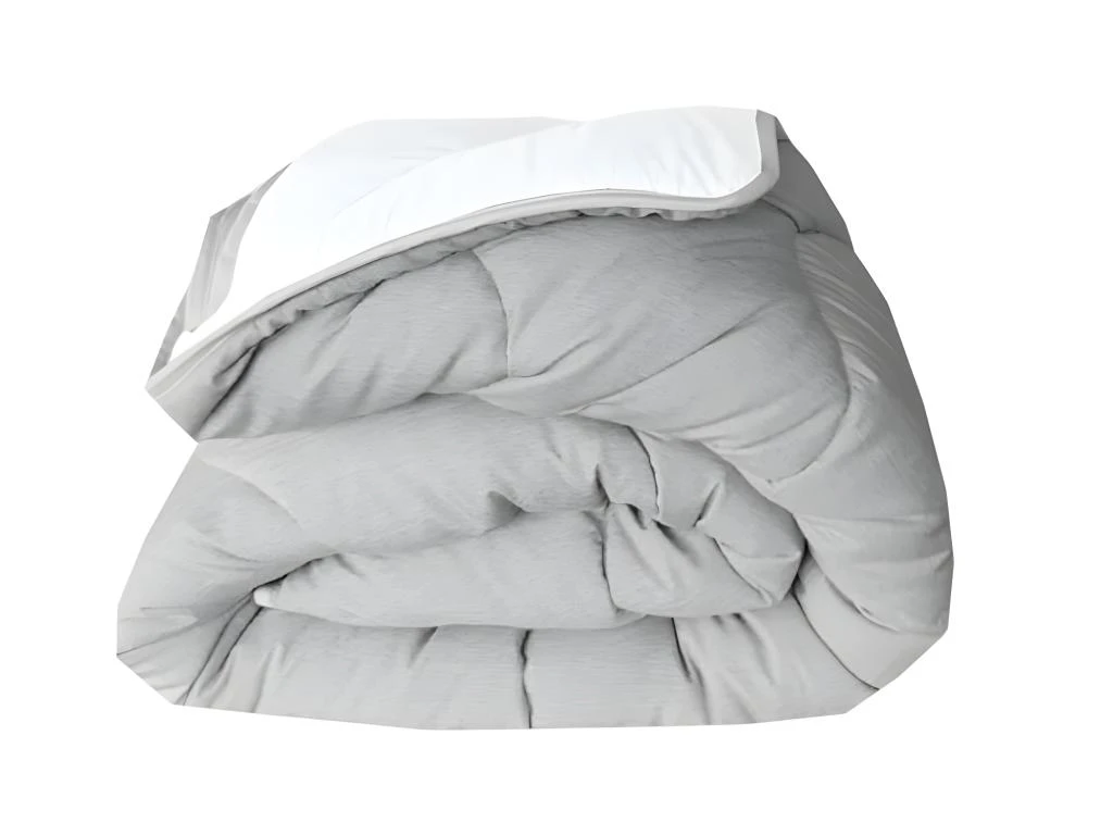 Couette Tempérée bicolore Blanc et gris chiné 140x200cm – Enveloppe : 100% Polyester Microfibre Gris Chiné d’un côté et Blanc de l’autre – Garnissage : 100% Polyester 300g/m² – Piquage : ondes – Fabrication Française.