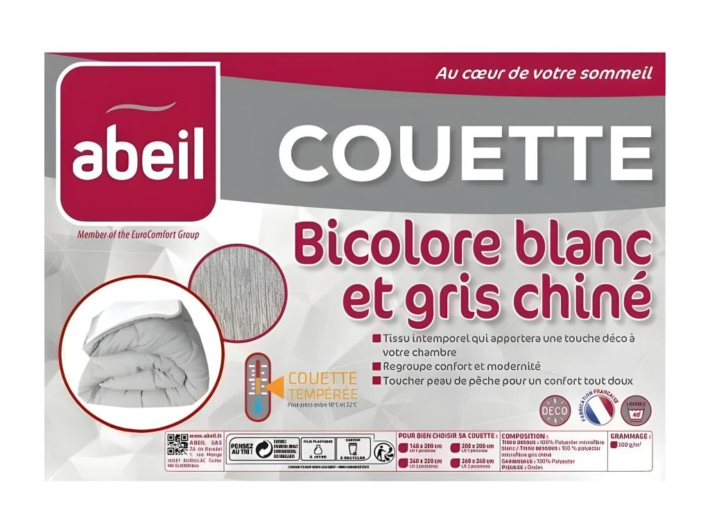 Couette Tempérée Bicolore Blanc et gris chiné 220x240cm – Enveloppe : 100% Polyester Microfibre Gris Chiné d’un côté et Blanc de l’autre – Garnissage : 100% Polyester 300g/m² – Piquage : ondes – Fabrication Française.