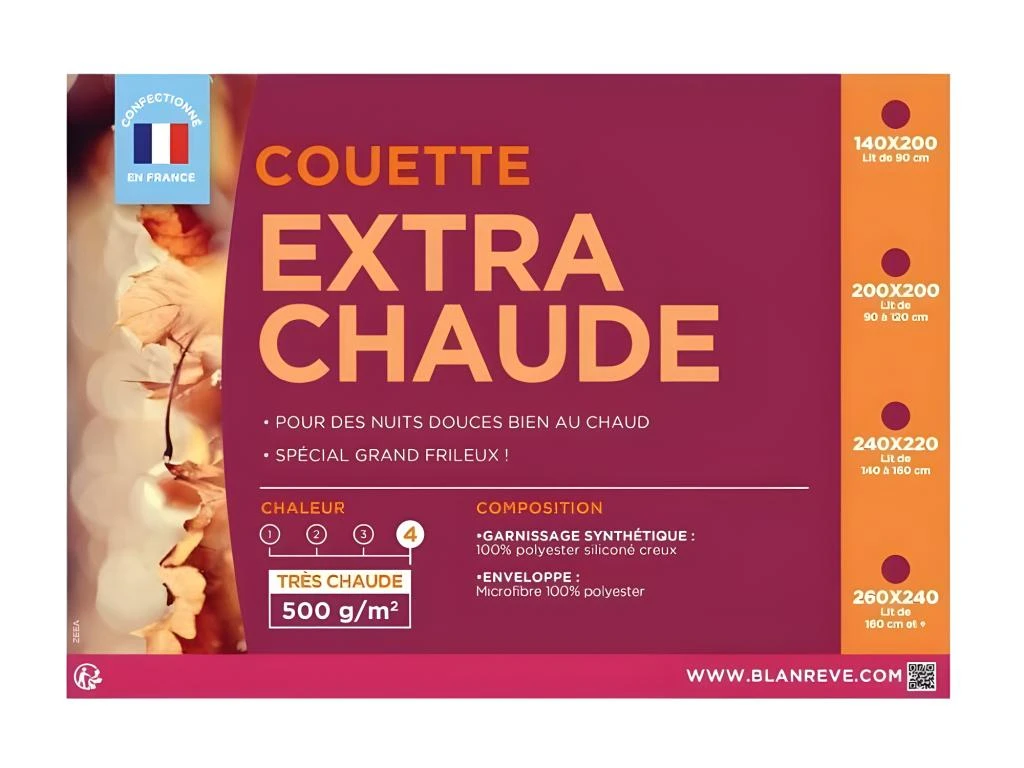 Couette extra chaude en microfibre – 140 x 200 cm – Enveloppe : microfibre 100% polyester – Garnissage : 100% polyester fibre creuse siliconée 500g/m² – Piquage Longiligne – Finition Biais – Coloris : blanc – Livrée dans une valise.