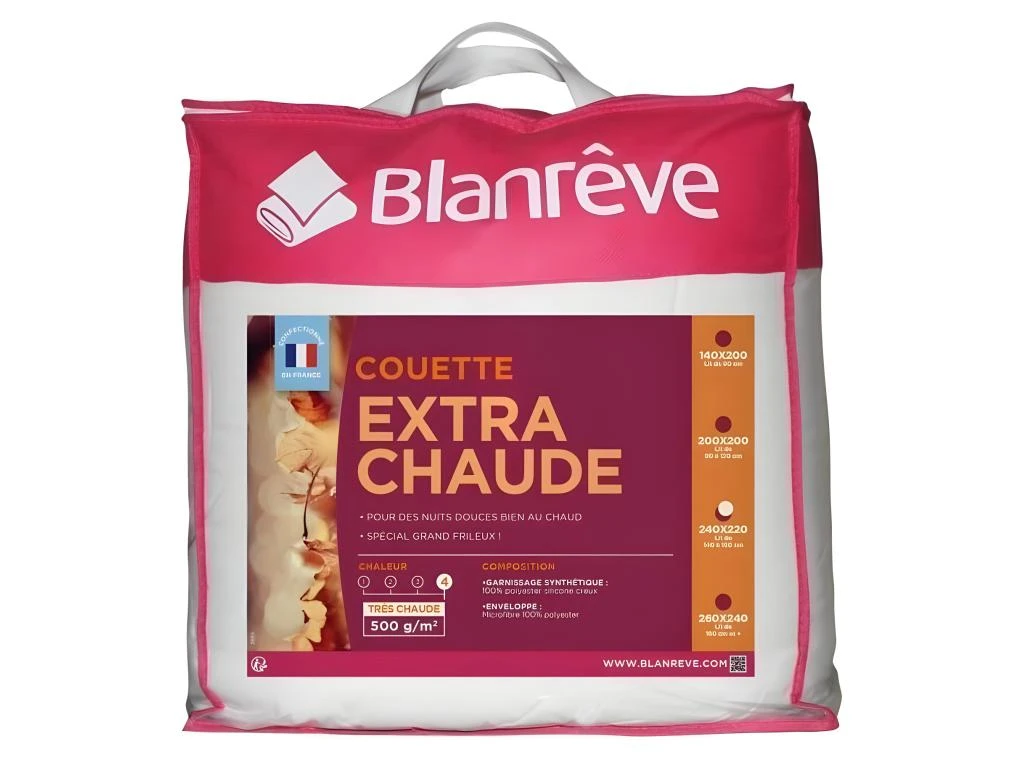 Couette extra chaude en microfibre – 220 x 240 cm – Enveloppe : microfibre 100% polyester – Garnissage : 100% polyester fibre creuse siliconée 500g/m² – Piquage Longiligne – Finition Biais – Coloris : blanc – Livrée dans une valise.