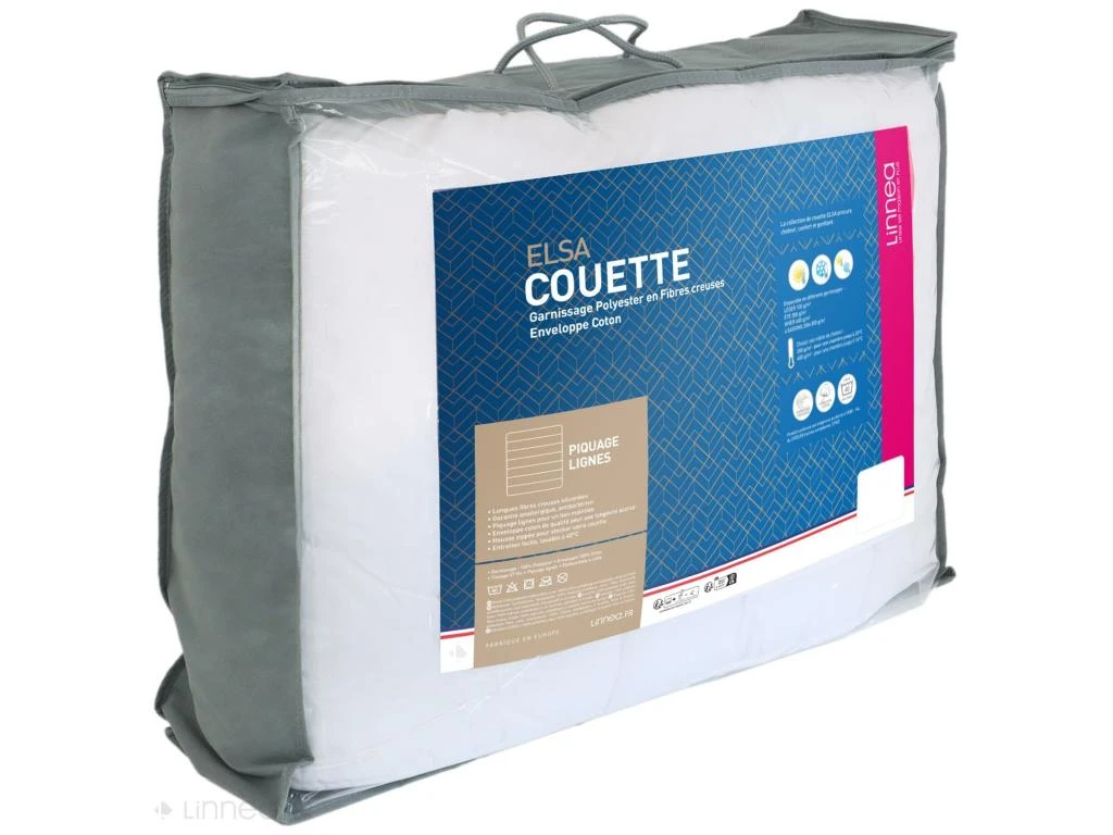 - Finition piquage lignes pour un bon maintien du garnissage avec une enveloppe pur coton de qualité pour une longévité accrue de la couette. Livré avec une housse pour stocker votre couette été durant l’hiver.