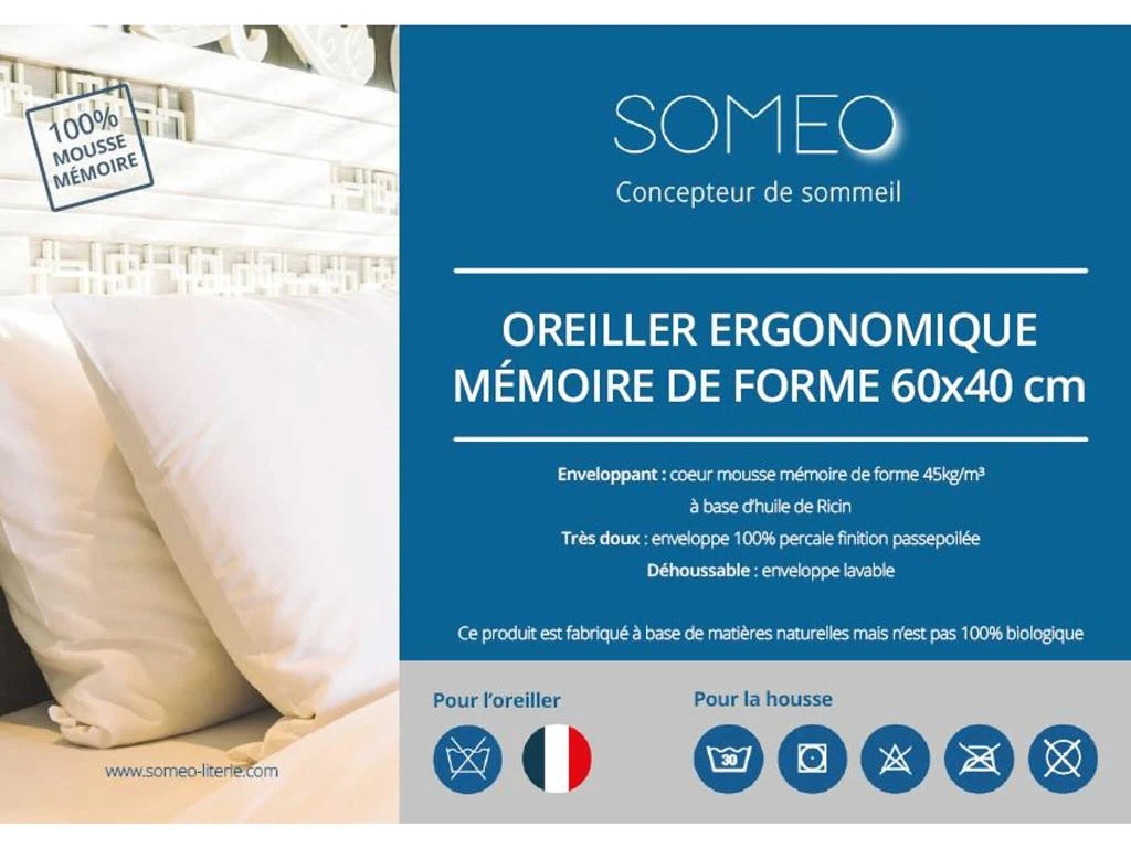 Conseils d’entretien : Pensez à laver la taie d’oreiller avant sa première utilisation. L’oreiller ergonomique n’est pas lavable. En revanche, la taie d’oreiller amovible se lave en machine à 30°C et peut être séchée au sèche-linge en programme doux. Le nettoyage à sec, le repassage ainsi que le blanchiment sont proscrits.