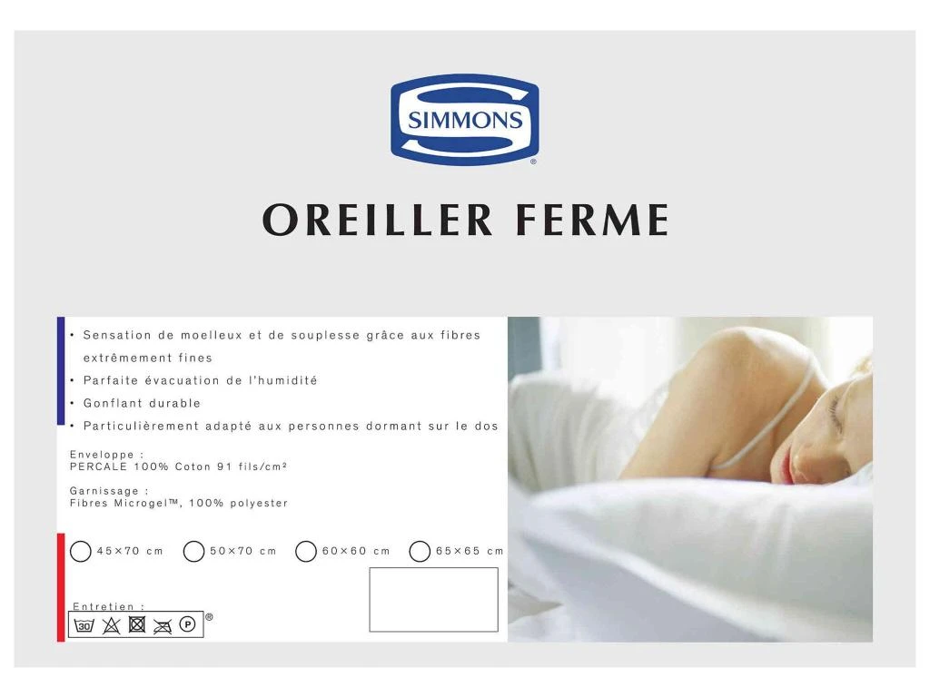 Conseils d’entretien de votre oreiller Microgel Ferme Simmons : Lavable en machine à 30°, blanchiment interdit, pas de sèche linge, repassage interdit, nettoyage à sec autorisé.