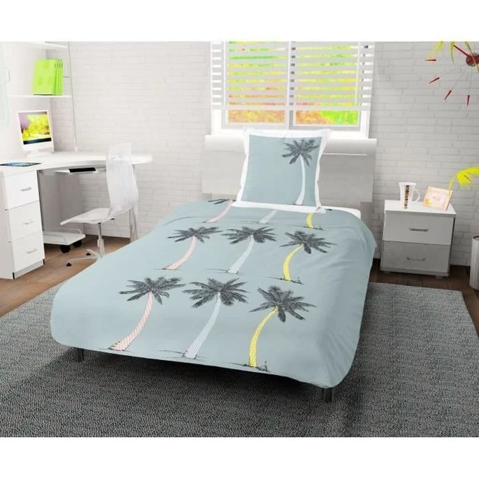 SOLEIL D’ OCRE Parure De Couette Palmier 100% Coton – 1 Housse De Couette 140 X200 Cm + 1 Taie D’oreiller – Bleu